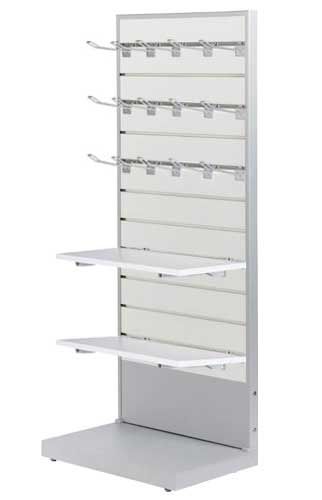 L-stativ med enkeltsidet Rillepanel / Slatwall panelvæg plus kroge og hylder.