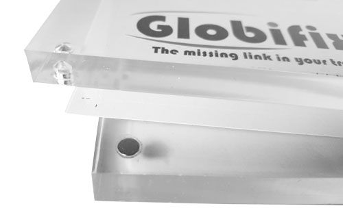 Bestående af 2 akryl-blokke med magnet i hver hjørne, der kan adskilles og samles for derved at holde på indsatte skiltepapir.
